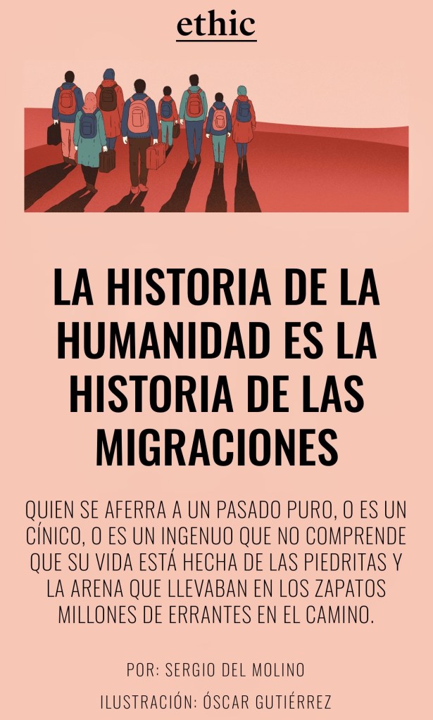 Me ha parecido necesario ocupar un espacio de reflexión en este blog con algunas de las ideas que Sergio del Molino expone en un interesante artículo publicado en el mes de febrero de 2026 en la revista Ethic, con el título «La Historia de la Humanidad es la Historia de las migraciones«
